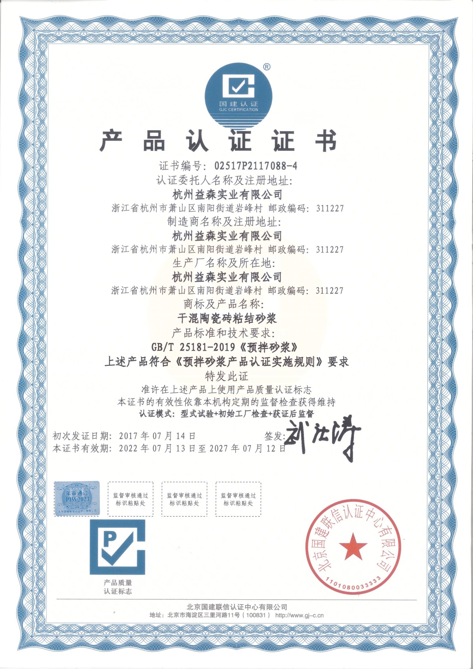 產品認證證書(干混陶瓷磚粘結砂漿)