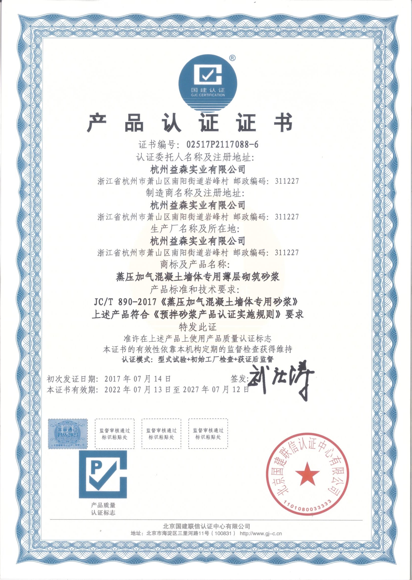產(chǎn)品認(rèn)證證書(蒸壓加氣混凝土墻體專用砂漿)